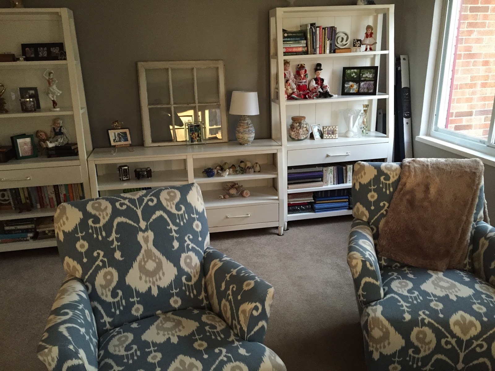 Since our tv and recliners were going in the basement, I had to start from scratch on furnishing the living room. I knew I wanted a lot of bookshelves on one wall, and while I first thought I'd have Noel build some to look like "built ins", I fell in love with a set of three book cases at Morris Furniture. It was the last one, floor model, on clearance! Score!